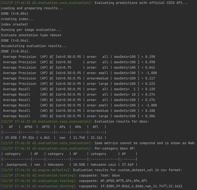 APs, APm, APl: これらは異なるオブジェクトのサイズ(小、中、大)に基づくAPです。小さいオブジェクトでは結果が利用できません(NaN)、中サイズでは11.748%、大サイズでは22.161%です。大きなオブジェクトの方がより高い精度で検出されていることを示しています。