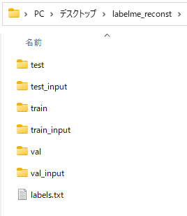その前にlabelme(他のアプリでもいいが,われわれの研究室ではlabelmeを使用)で作成したannotaionファイル(jsonファイル)と画像をtrain用,val用,test用に分ける.8:1:1程度か?